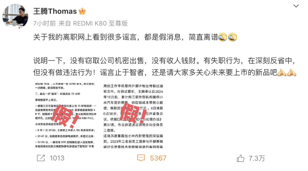 王腾随后在社交平台发文回应:“很惭愧跟大家说声抱歉,过去犯了一些错误,接受该有的代价。”并在9月9日再次发微博辟谣了市场上一些关于其“窃取公司机密出售,收人钱财”的传言,表示“有失职行为,在深刻反省中,但没有做违法行为!”甚至在辟谣最后再次未小米未来要上市的新品进行宣传。