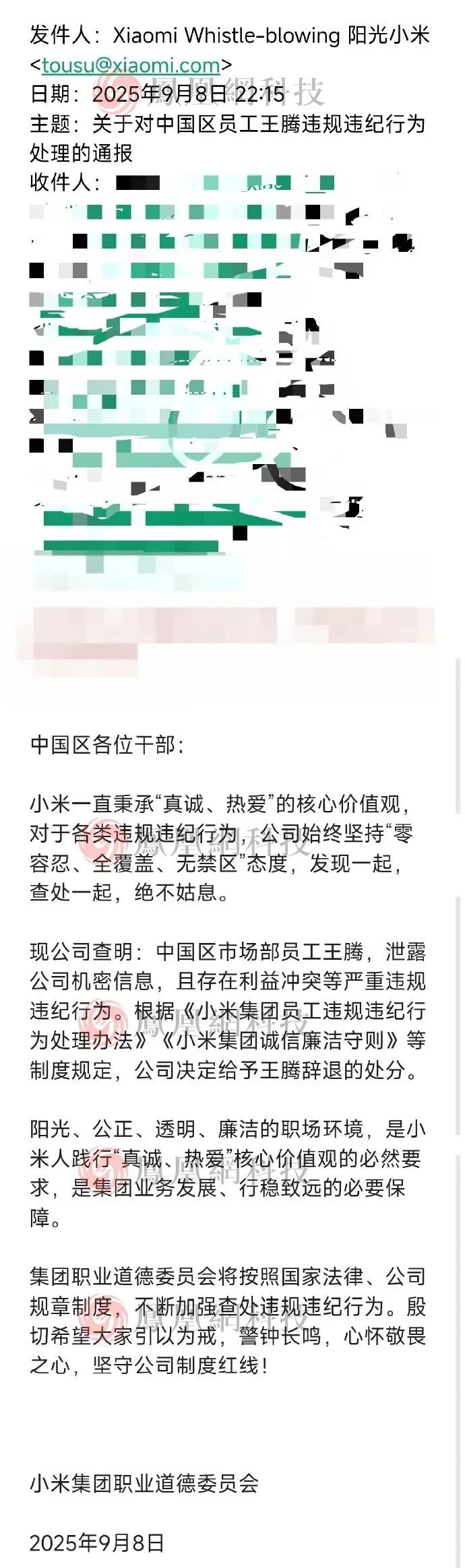9月8日晚,小米集团职业道德委员会的一则内部通报邮件显示,中国区市场部员工王腾因“泄露公司机密信息,且存在利益冲突等严重违规违纪行为”被公司辞退。