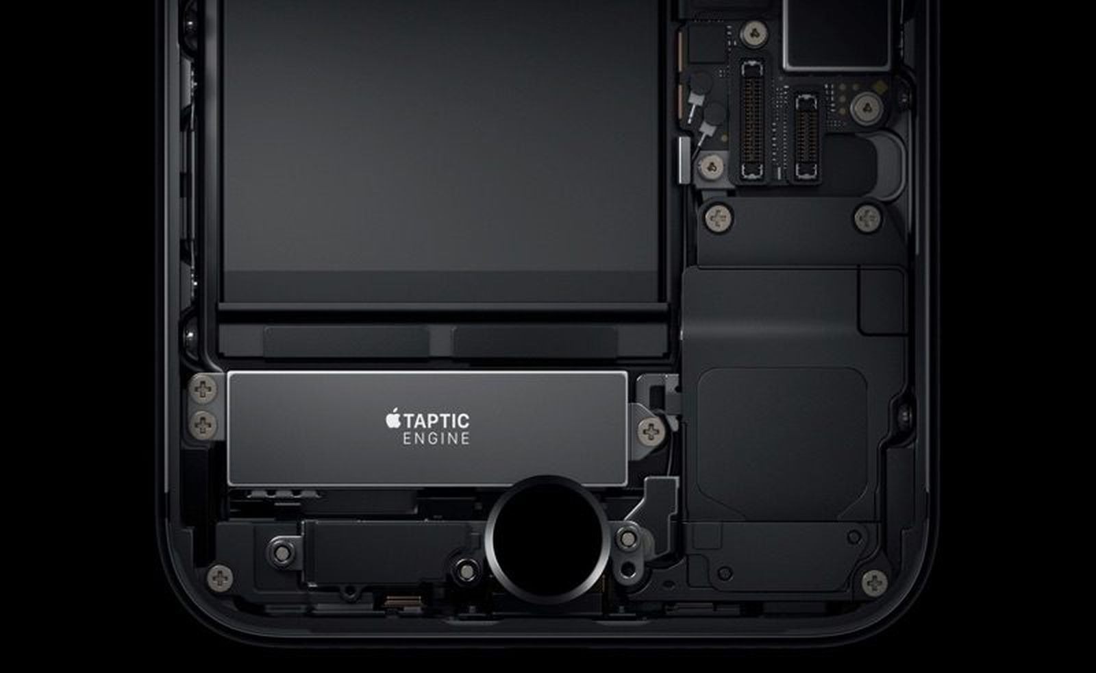 为了保证反馈的真实感,反馈应该直接作用于按压的地方。iPhone 7上的Home键如此真实,就是因为这个超大号的Haptic Engine震感马达在按键下方。