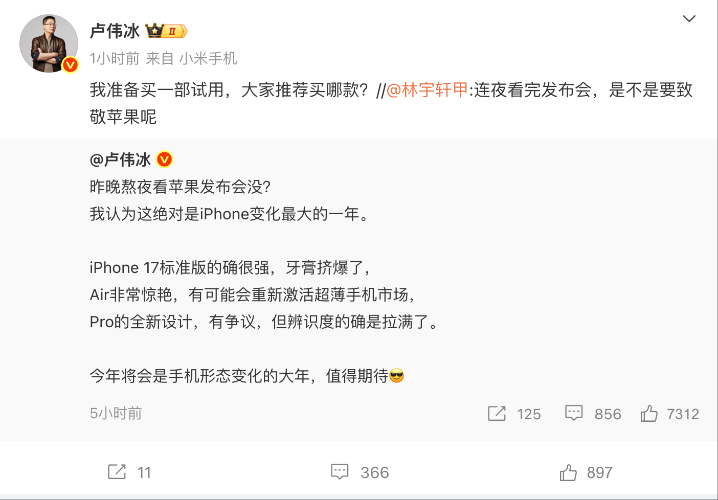 凤凰网科技讯 9月10日,在小米集团合伙人/总裁、手机部总裁、小米品牌总经理卢伟冰评价“iPhone 17标准版很强,Air非常惊艳”之后,再次发文,准备买一部试用,并询问网友推荐买哪款?