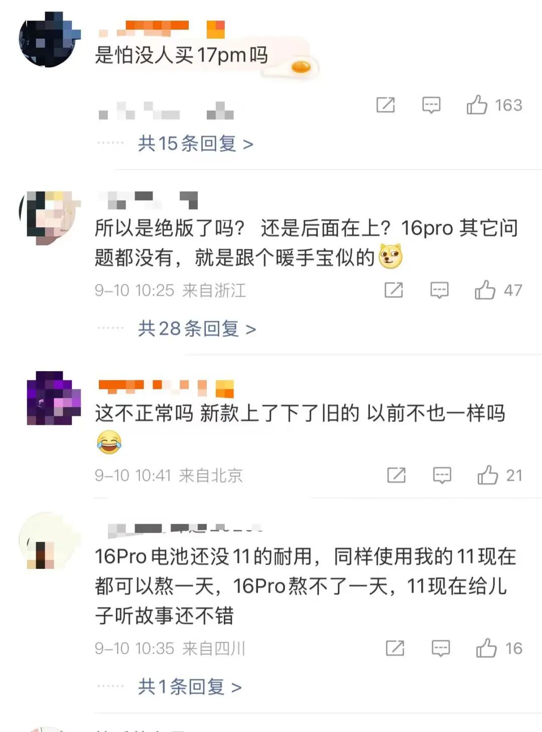 这一动作引发网友热议。有网友称,“是怕没人买17pm吗?”“所以16P是绝版了吗?”“我一星期前刚买的16Pro”。