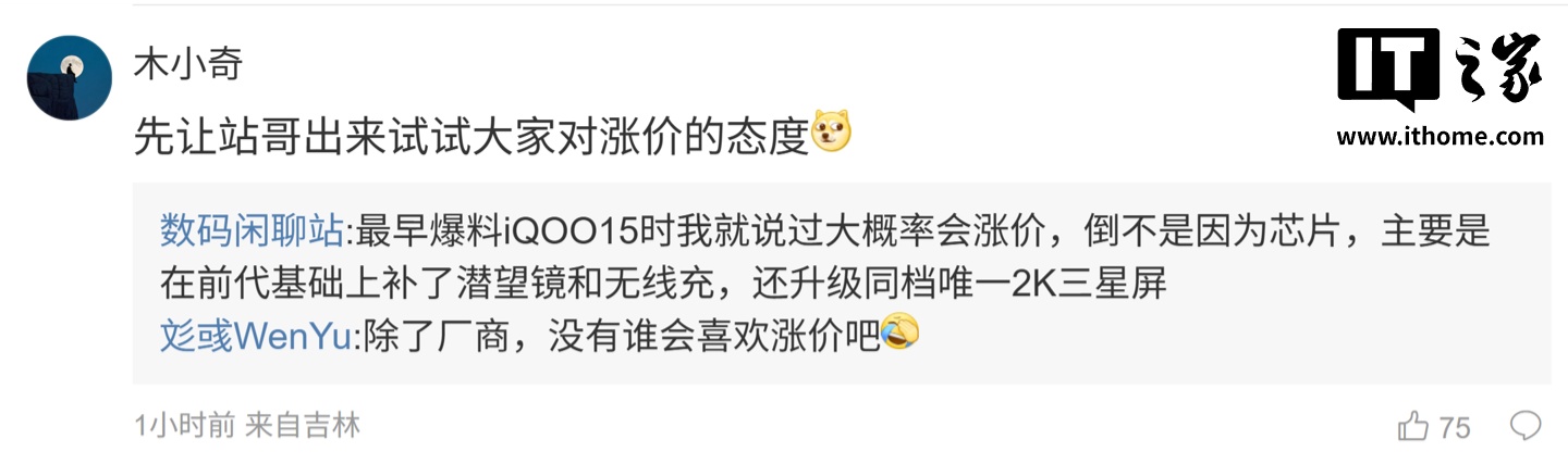 另一名用户则表示:“先让站哥出来试试大家对涨价的态度 ”,博主回复道:“最早爆料 iQOO15 时我就说过大概率会涨价,倒不是因为芯片,主要是在前代基础上补了潜望镜和无线充,还升级同档唯一 2K 三星屏”。