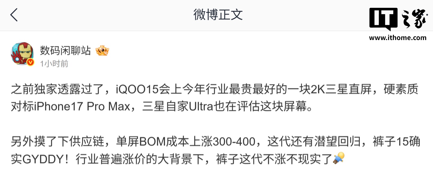 IT之家 9 月 10 日消息,博主 @数码闲聊站 今天在微博透露,iQOO 15 手机将会上“今年行业最贵最好”的 2K 三星直屏。