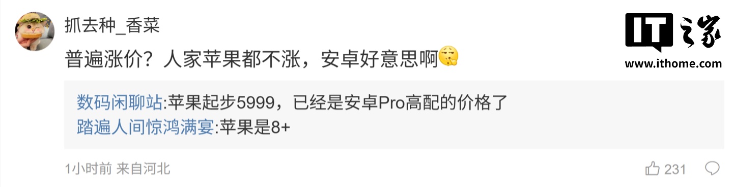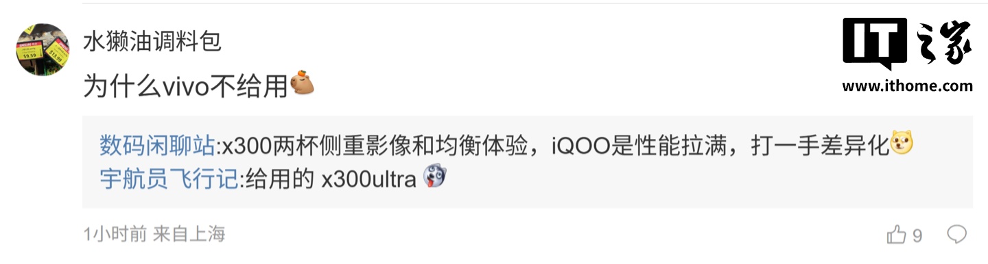 后续有用户在评论区询问:“普遍涨价?人家苹果都不涨,安卓好意思啊”,博主回复道:“苹果起步 5999,已经是安卓 Pro 高配的价格了”;另一名用户则询问道:“为什么 vivo 不给用”,博主回复道:“X300 两杯侧重影像和均衡体验,iQOO 是性能拉满,打一手差异化 ”。