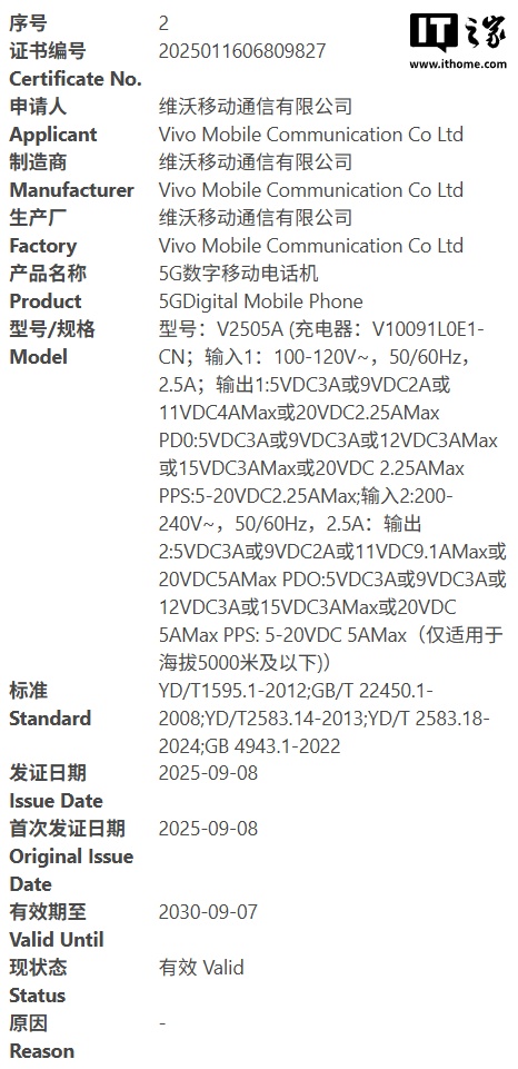 型号为 V2505A 的 vivo 新机已于昨天通过 3C 认证,支持 100W 快充,预计为 iQOO 15。