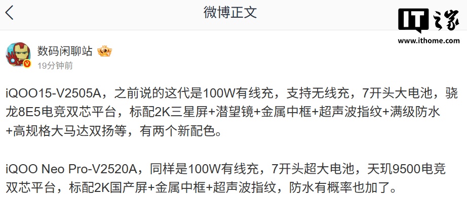 IT之家整理博主 @数码闲聊站 此前爆料 iQOO 15 手机参数如下: