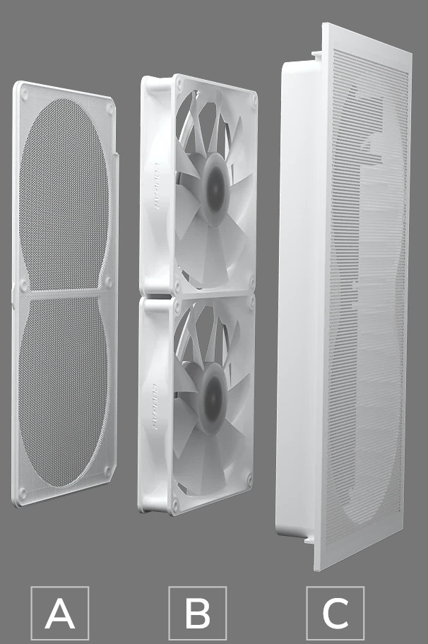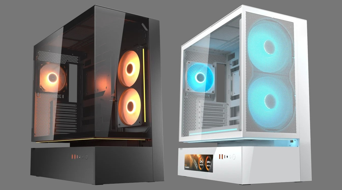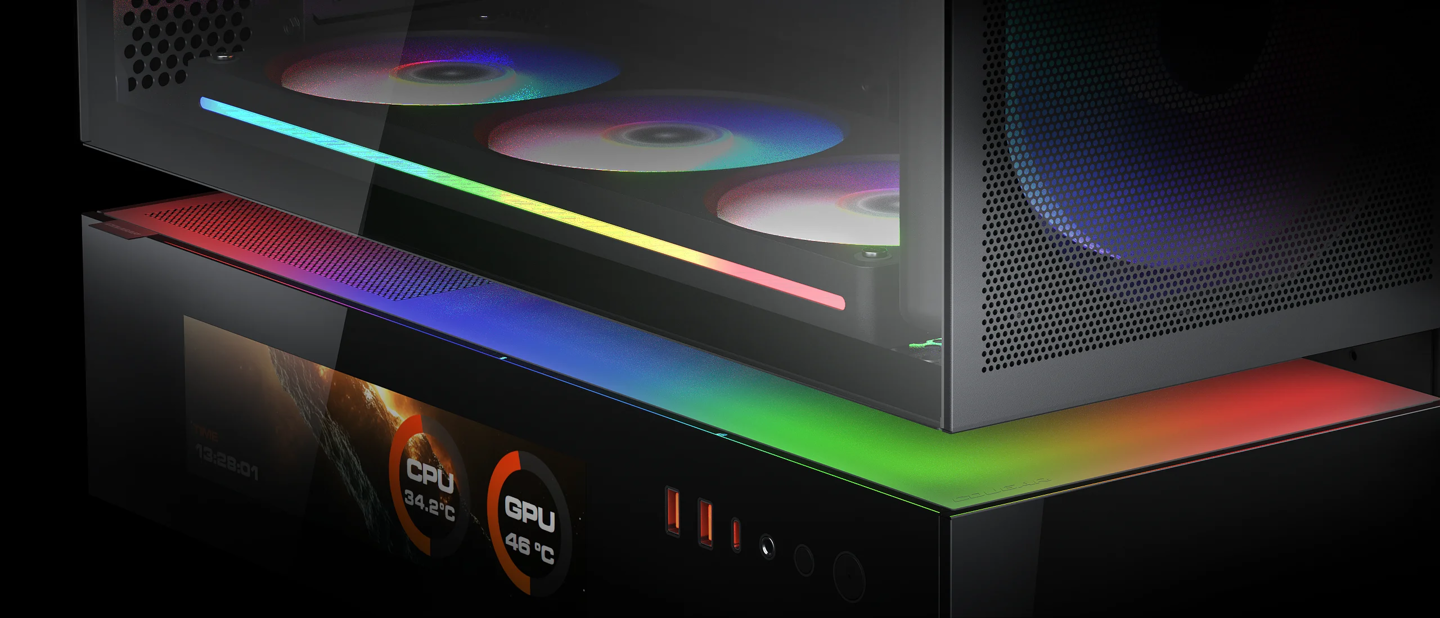 其标准款采用左 + 前两面玻璃侧透设计;Vision 变体左侧下方配备一块 1920×462 分辨率 60Hz 刷新率 9.16 英寸 IPS TFT LCD 显示屏;Mesh 变体则在保持左侧透的同时前方配备一块网孔面板 + 双 160mm ARGB PWM 风扇 + 防尘滤网的三合一模组面板。