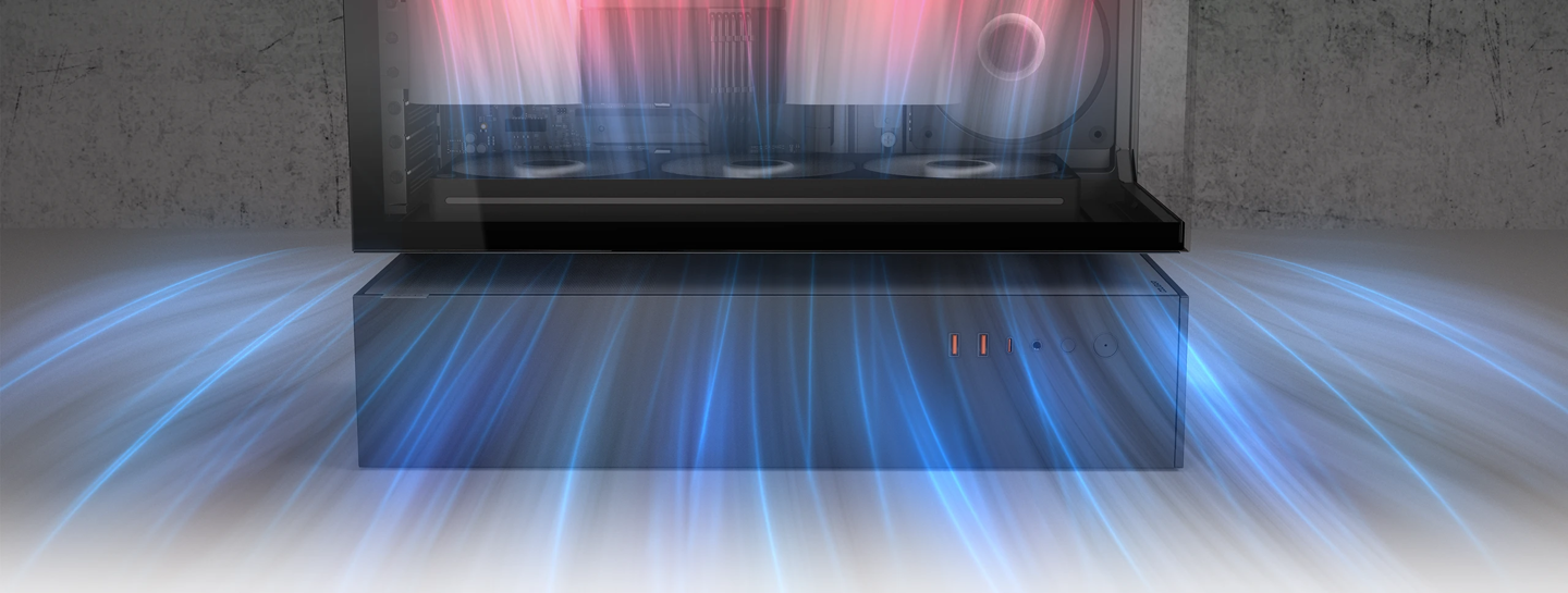 骨伽表示传统机箱的不独立上下仓结构仅可通过上盖和前后面板进气,限制了散热能力;而 CFV235 的设计能让气流更自由、有效率地流动,在美学上也更独特前卫。