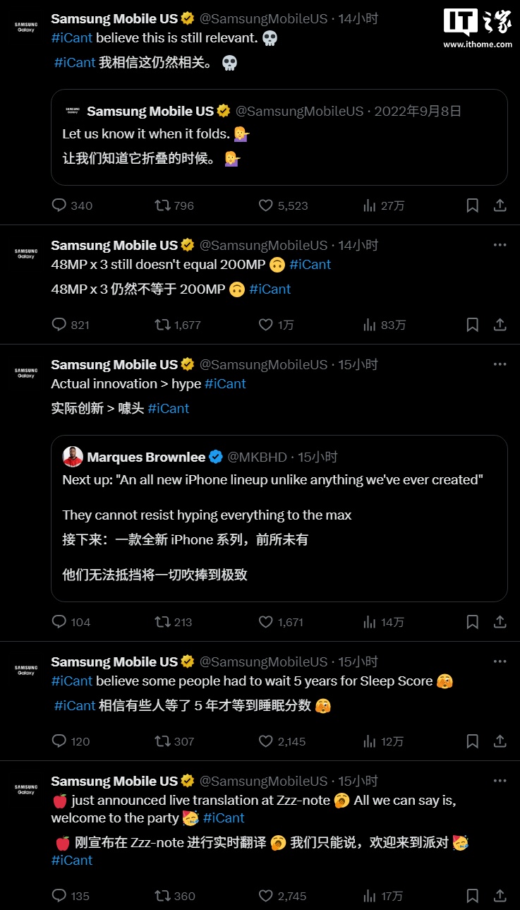 IT之家 9 月 10 日消息,苹果今日凌晨发布了 iPhone 17 系列和 iPhone Air 新机,作为苹果的老对手,三星也在发布会后开启了“嘲讽模式”。