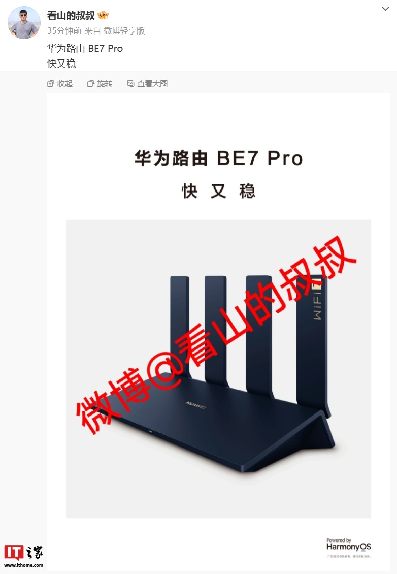 此外,博主还放出了华为路由 BE7 Pro 的外观图片。图片显示该路由整体外观与“AX6 Pro”相近,颜色为黑色,呈哑光质感,路由的天线处有 Wi-Fi 7 字样。另外,图片右下角还印有“Powered by HarmonyOS”。