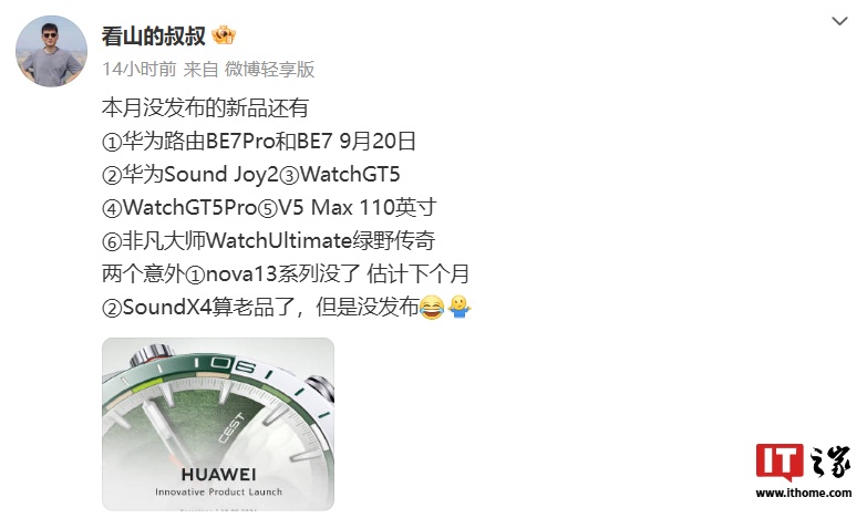 IT之家 9 月 12 日消息,博主 @看山的叔叔 今日发文爆料华为本月还未发布的新品,并透露了部分新品发布时间,包括华为路由 BE7 系列、nova 13 系列手机等。新品爆料详情如下: