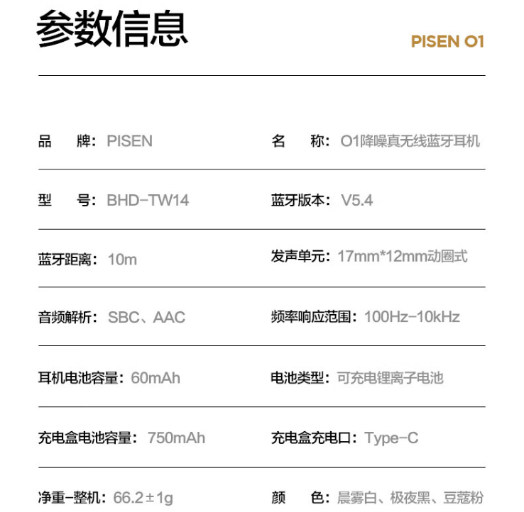品胜 O1 配备跑道型动圈单元 + 复合振膜,支持 IP54 级防水、ENC 智能通话降噪;耳机单次使用续航约 8h,配合充电盒使用续航约 45h;耳机支持触控,可实现播放 / 暂停、音量调节、接听 / 拒接电话、切歌等操作。