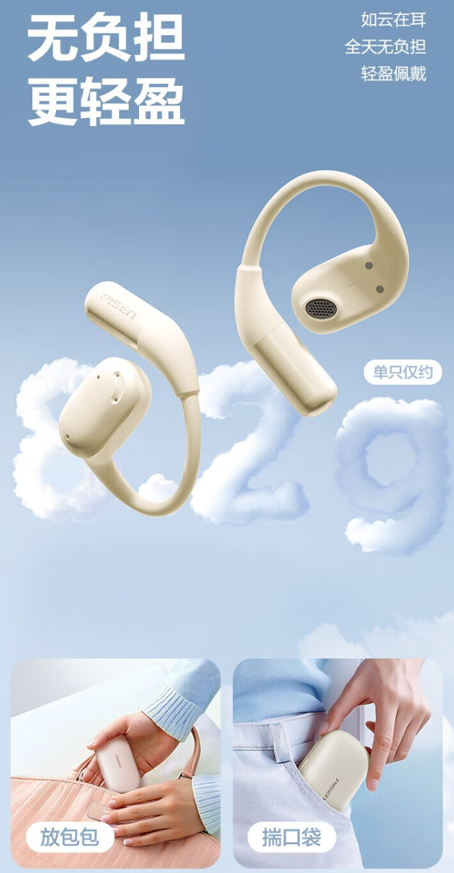 据介绍,品胜 O1 开放式耳机拥有晨雾白、极夜黑和豆蔻粉 3 种配色,单耳重约 8.2g,搭载品胜自研 Orient 定向传声技术。