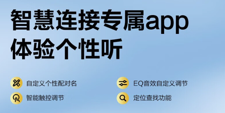 该耳机采用蓝牙 5.4 连接,拥有专属 App,支持自定义个性配对名、EQ 音效自定义调节、智能触控调节、定位查找等功能。