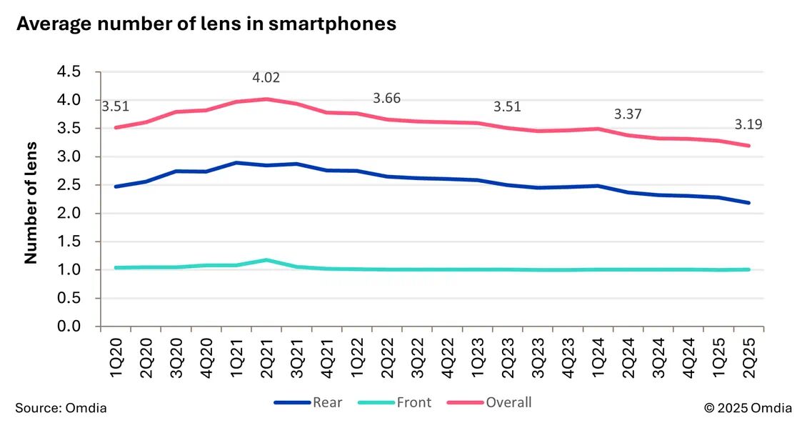 2025 年第二季度,智能手机后置摄像头平均数量降至 2.18 个,低于去年同期的 2.37 个,自 2021 年第一季度达到 2.89 个峰值以来,已连续 13 个季度下降。