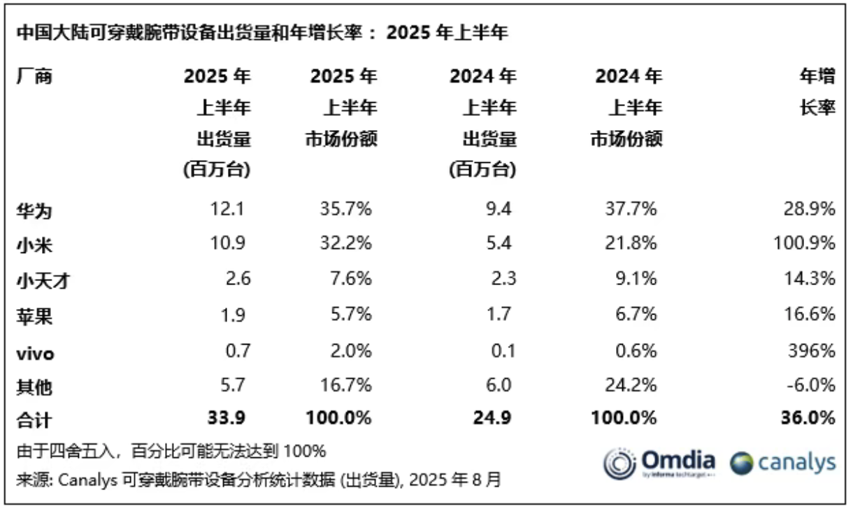 9月10日,Canalys(现并入Omdia)数据显示,2025年上半年,中国大陆可穿戴腕带设备出货量达3390万台,同比增长36%,继2024年下半年33%的增长后持续强势攀升。