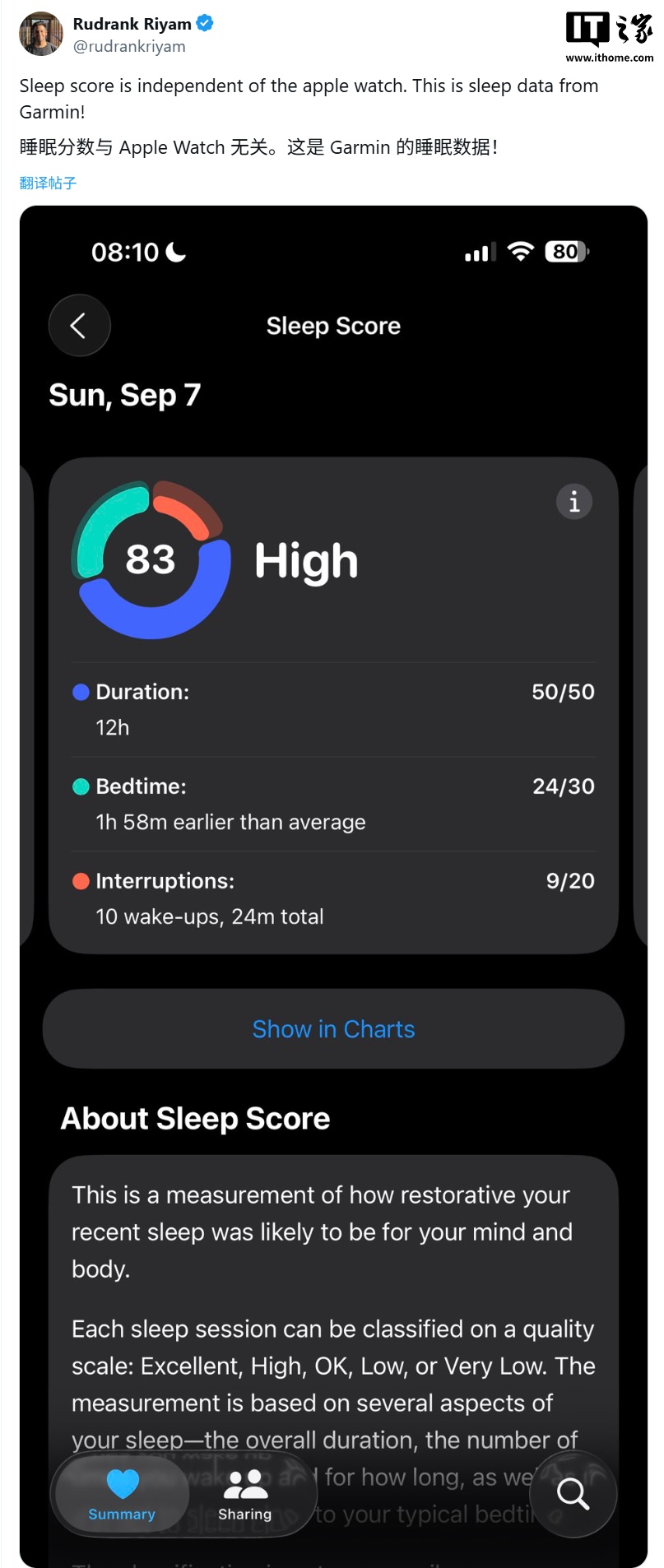 IT之家注:用户并不需要购买 Apple Watch,只要设备能够记录睡眠数据,例如佳明(Garmin)的智能手表,用户即可在 iPhone 的健康 App 中查看睡眠评分。