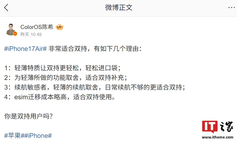 OPPO ColorOS 设计总监陈希微博昨日也分享了看完了苹果发布会的感想,称全新 iPhone Air 非常适合双持,原因如下:
