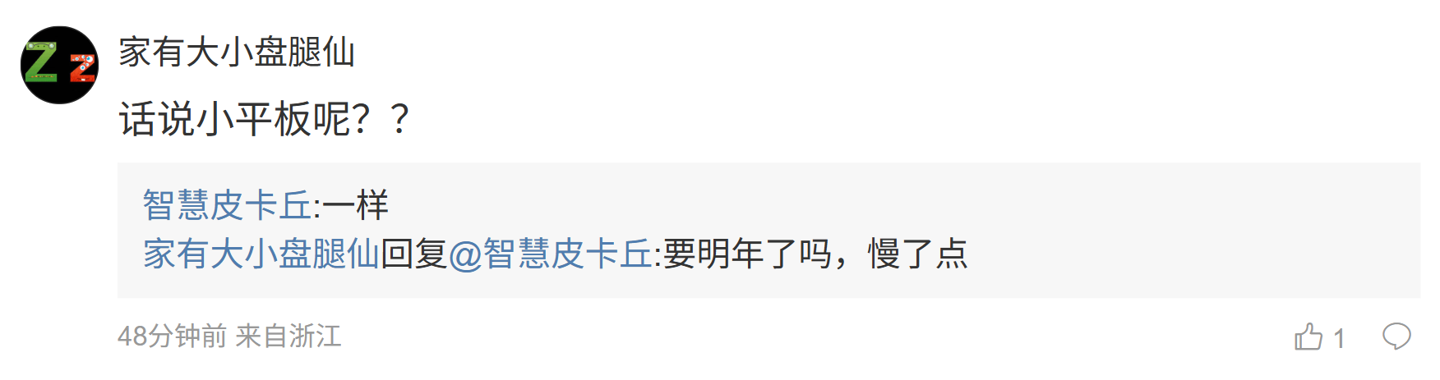 后续有用户在评论区询问:“手机呢?”,博主回复道:“各家也在搞”;另一名用户则询问道:“话说小平板呢??”,博主则回复道:“一样”。