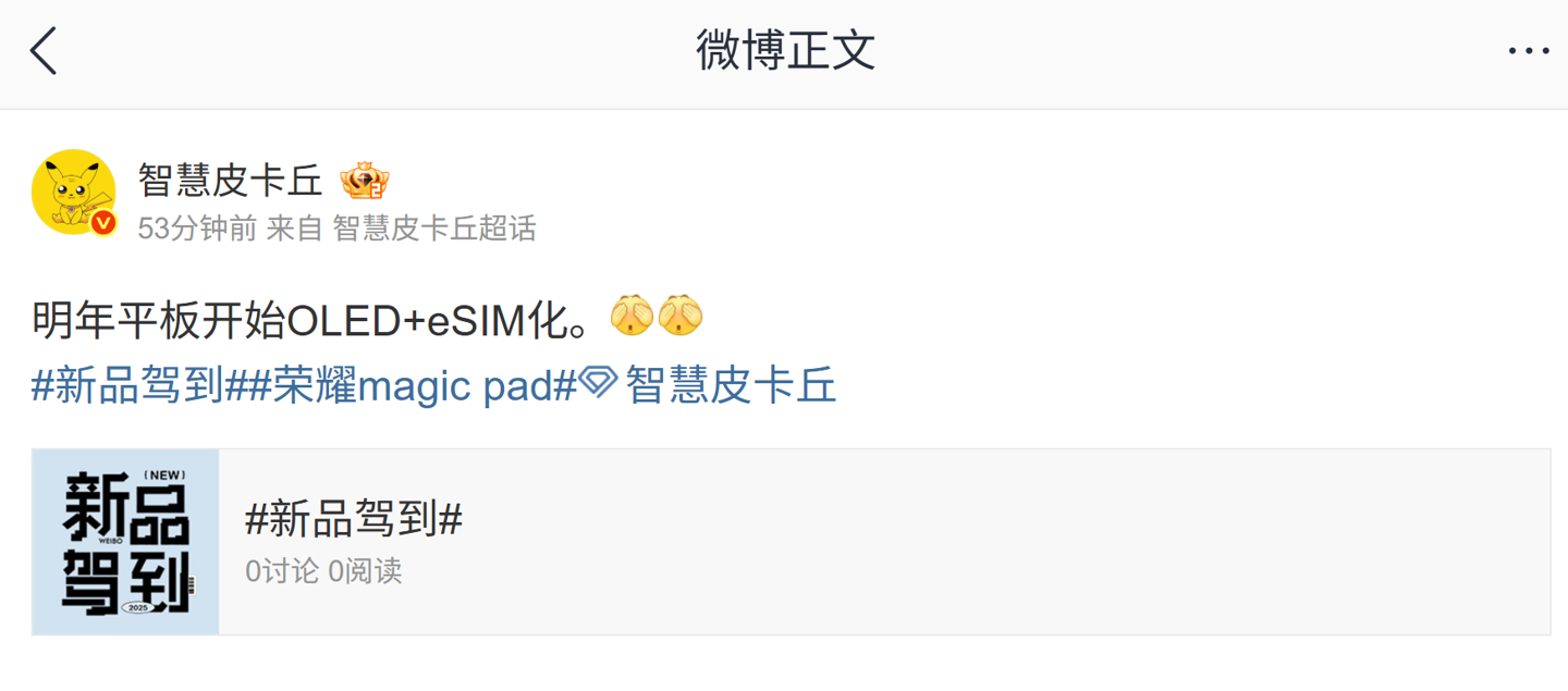 IT之家 9 月 11 日消息,博主 @智慧皮卡丘 今天在微博透露,某厂明年推出的平板将搭载 OLED 屏幕、开始 eSIM 化。