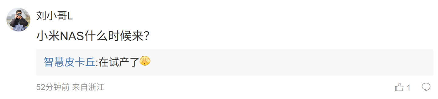 另外一名网友则询问道:“小米 NAS 什么时候来?”,博主表示:“在试产了”;另一名网友则询问:“那有能打电话的吗 ”,博主回复道:“