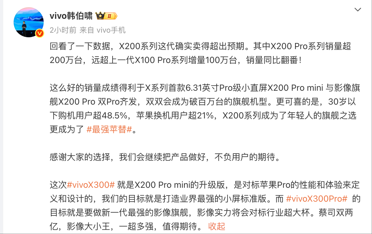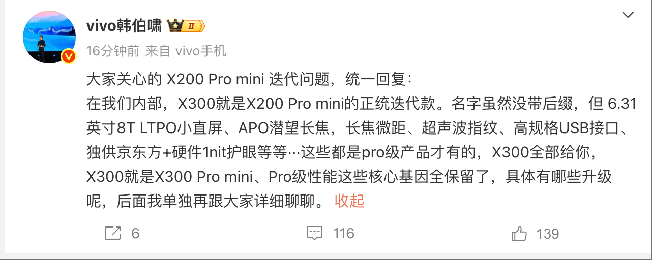 稍早前,韩伯啸称,这次vivo X300就是X200 Pro mini的升级版,是对标苹果Pro的性能和体验来定义和设计的,目标是打造业界最强的小屏标准版。