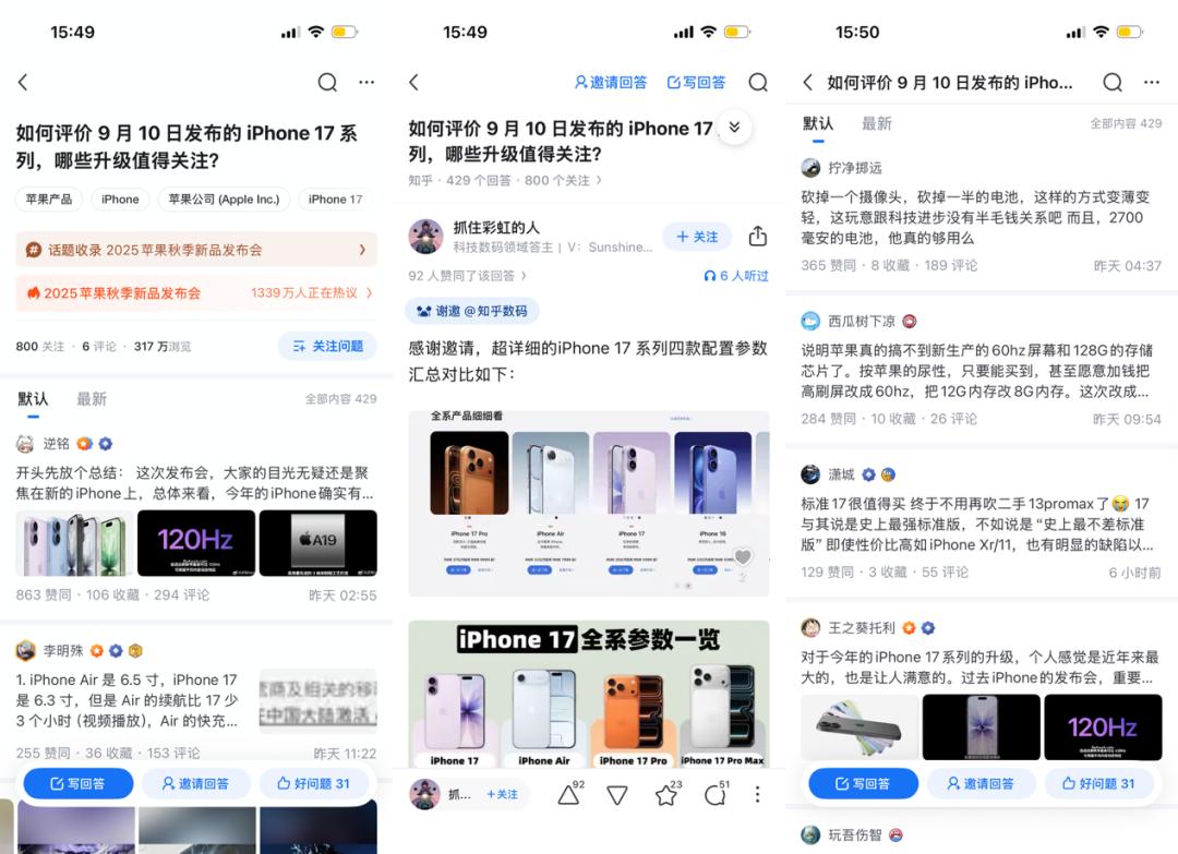 知乎用户的参与以长文式回答为主,回答内容具有深度和逻辑性,围绕苹果发布会的技术细节、产品对比、使用体验等展开。即便不是高热问题,也能引发数十篇优质回答,只是整体参与用户量有限。