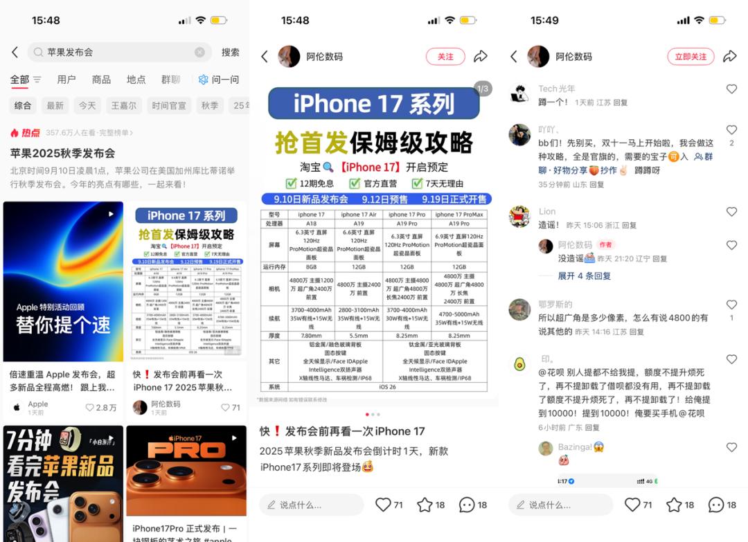 来自数码领域的KOL,将原本单一、零散的事实信息整理成了有深度、有条理的分析和观点,满足了用户“知其然”后,更想“知其所以然”的需求。比如微博联合现场博主围绕用户关注的功能和卖点,上手体验了iPhone17、AirPods Pro 3等产品,传递出了更多的增量信息。