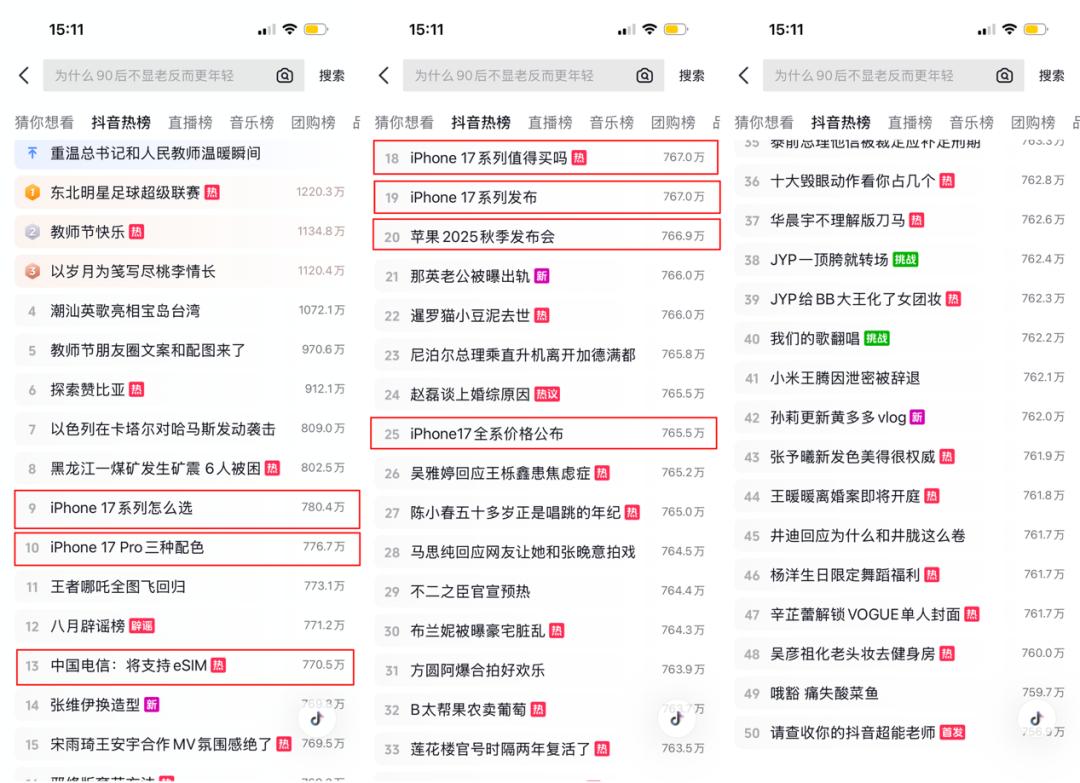 抖音热榜上同样有7个苹果发布会相关的话题在榜,集中在价格、配色等预期话题上,衍生的讨论比较有限。抖音热榜是“信息的最大公约数”,但公共讨论和破圈能力受到了算法的限制。
