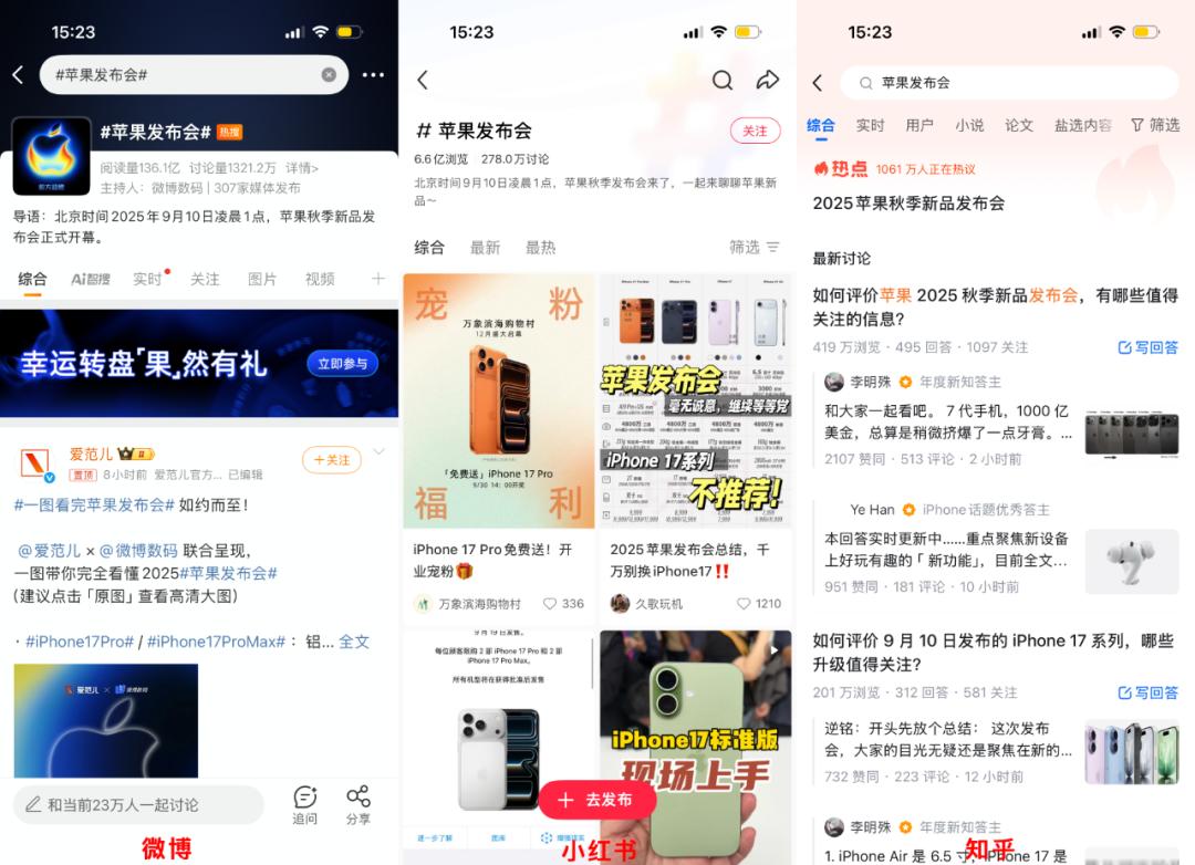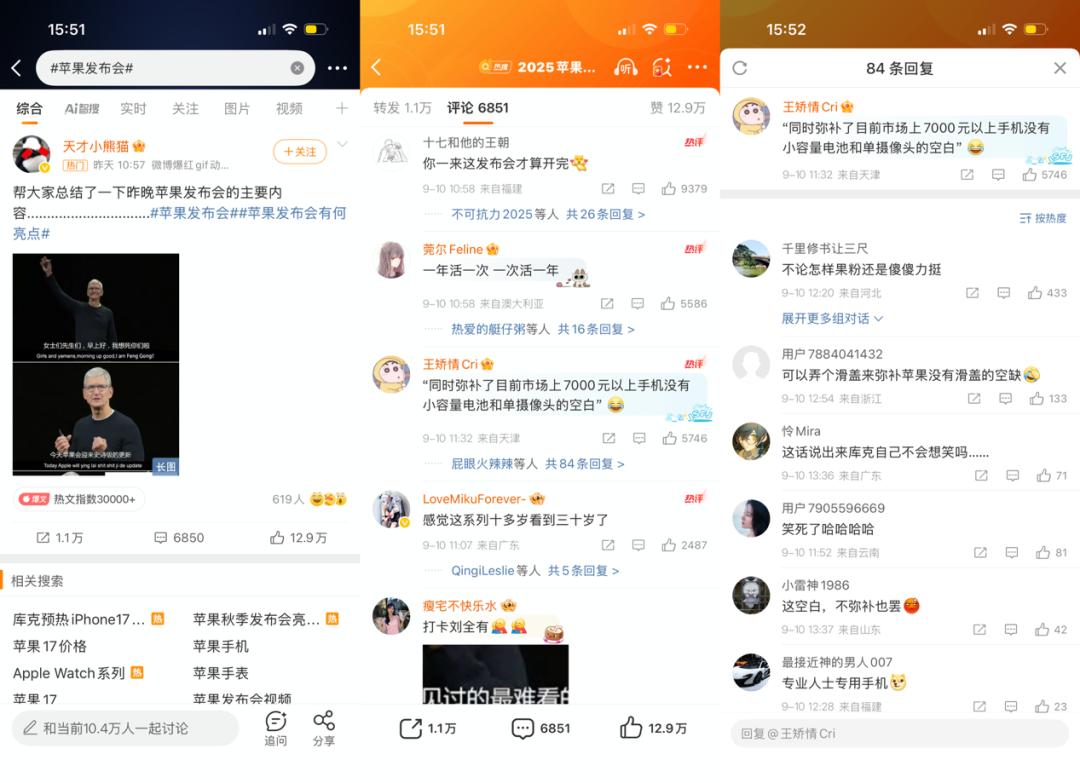 由于发布会本身的内容就是单向传播的,普通用户参与内容创作的门槛偏高,能否形成多维度讨论与二次传播,可以说是激励用户参与的关键要素,取决于平台是否提供了足够的衍生切入点,是否具备及时的反馈机制,同时也是衡量不同社交平台运营能力和话题生命力的抓手。