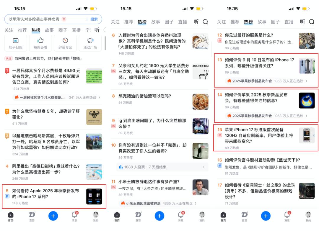 知乎热榜的话题集中在iPhone 17上,除了120Hz刷新率这样的技术细节讨论,其他的话题以发布会本身为主。和知乎问题驱动和答案沉淀的机制有关,容易形成“慢热长尾”的知识复利,但量级适中、峰值不高。