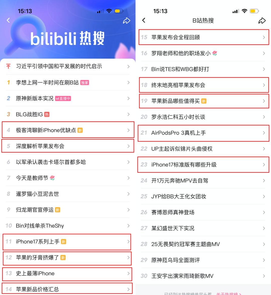 B站热搜呈现出了“苹果发布会”霸榜的态势,相关话题占比超过了三分之一,包括深度解析、上手体验、价格汇总等不同维度。B站的话题衍生和跨圈能力稍弱,但“圈内”的技术浓度和质量极高,维持了更长时间的关注度,也让UP主有时间去打磨内容。