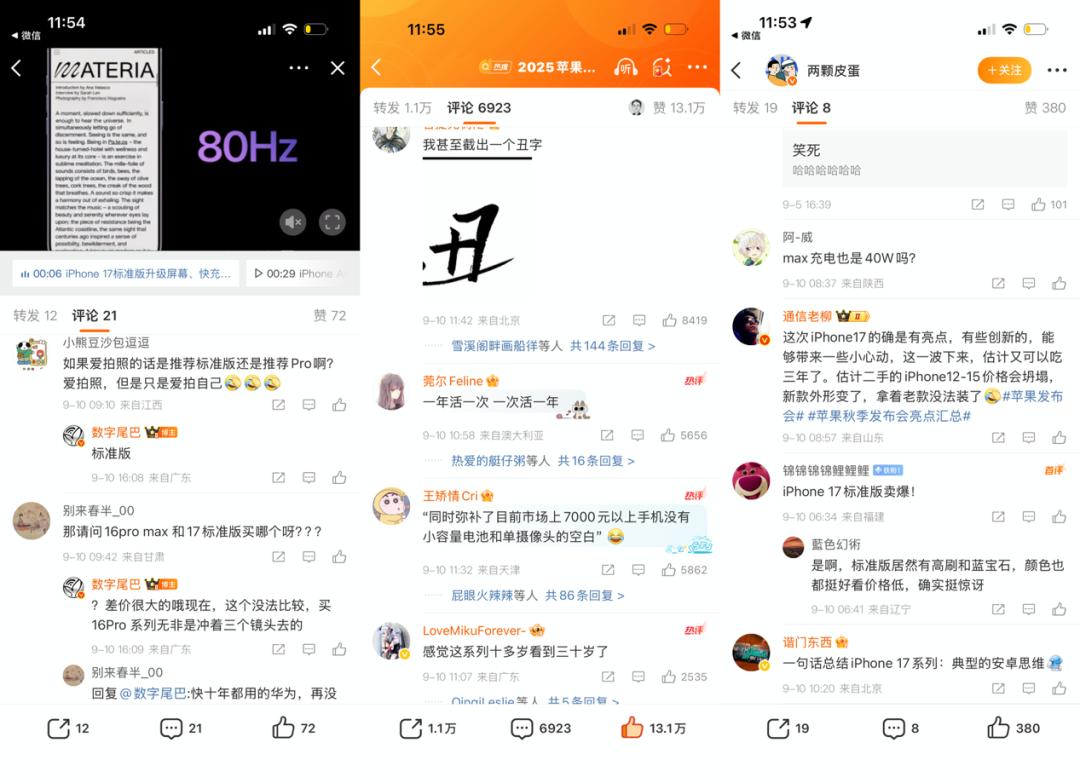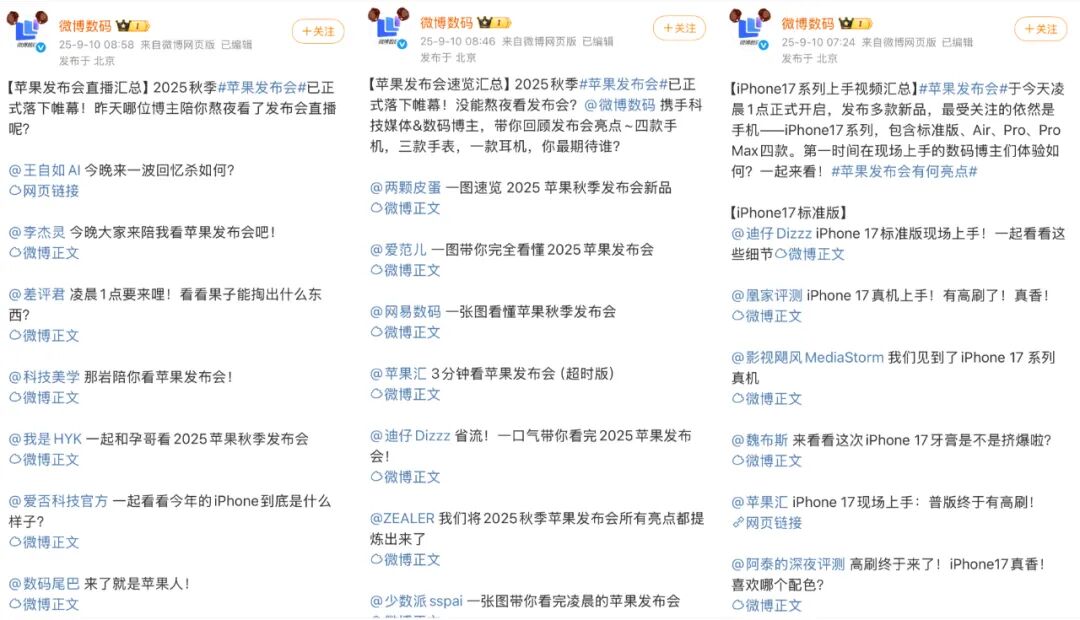 其中微博数码在苹果发布会前一天就组织了“大V报道团”,和多位KOL连线实时解读发布会内容;在发布会结束后,送上了一波长图和视频“速览”,并针对iPhone 17系列、新款Apple Watch、AirPods Pro 3等产品第一时间输出了上手视频和专业解读。