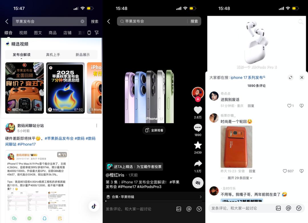 以“苹果发布会”的话题为例,微博24小时内阅读量约1.5亿,创造了15.1万讨论、53.6万次互动;小红书上有3900多万次浏览、10万以上讨论;知乎则显示有1061万人“正在热议”。抖音和B站并未公开话题的详细数据,不过抖音上相关热点话题的阅读量普遍在三四千万级别,B站上几个推荐视频的播放量也达到了10万量级。