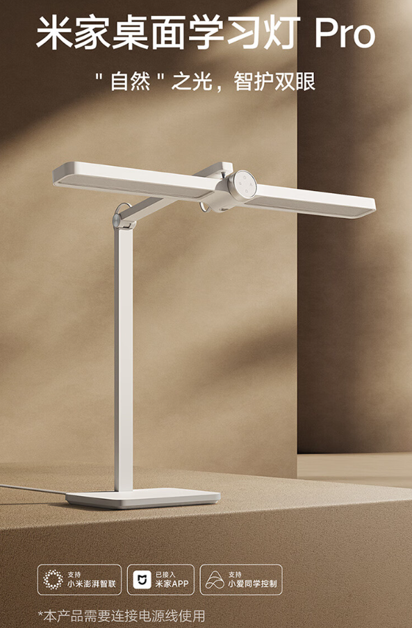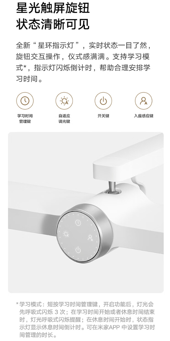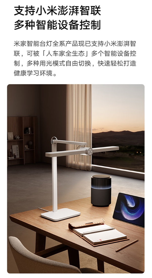 米家智能台灯全系支持小米澎湃智联,可被“人车家全生态”多个智能设备控制。小米米家桌面学习灯 Pro 采用旋钮交互操作,拥有学习时间管理键、自适应调光键、开关键和入座感应键。
