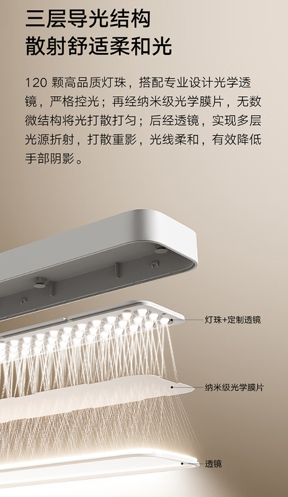 该学习灯采用两段式出光长灯头设计,1.2m 规格学习桌照度大于 300lx,宣称满足《中小学校教室采光和照明卫生标准》;该灯还采用三层导光结构,配备 120 颗灯珠。