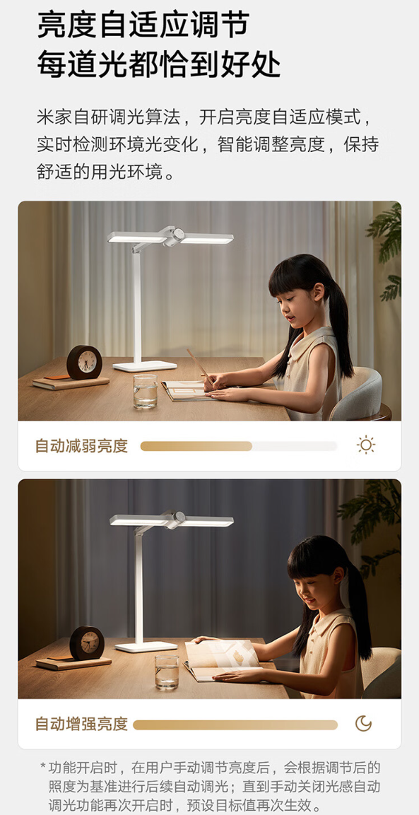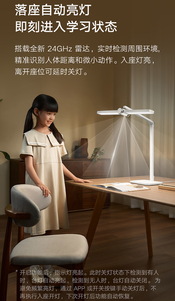 这款台灯搭载全新 24GHz 雷达,能够实时检测周围环境,识别人体距离和微小动作,实现入座亮灯、离座延时关灯功能;采用米家自研调光算法,开启亮度自适应模式后可实时检测环境光变化,智能调整亮度。