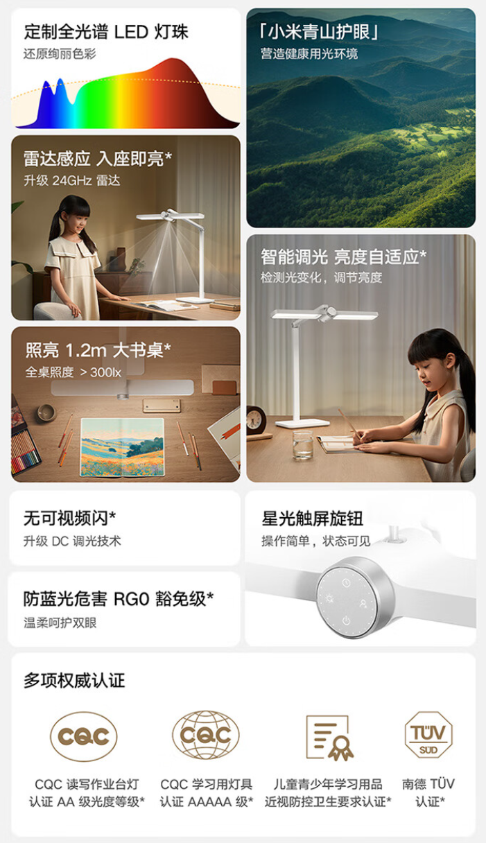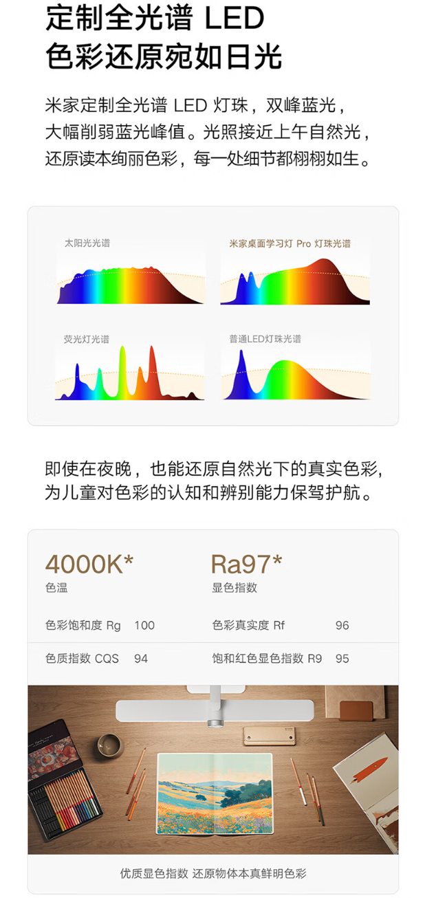 据介绍,小米米家桌面学习灯 Pro 采用定制全光谱 LED 灯珠,双峰蓝光,大幅削弱蓝光峰值,光照可接近上午自然光。同时具备 4000K 色温、色彩饱和度 Rg 100、色质指数 CQS 94,以及 Ra97 显色指数。
