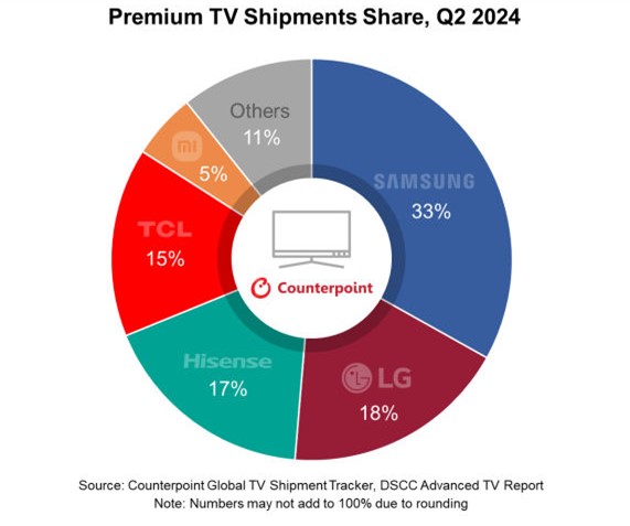 根据Counterpoint Research 9月6日发布的数据,三星电子在包括QD-Mini LED和OLED的高端电视市场保持领先地位,市场份额为33%。不过,这是三星在高端电视市场出货量市场份额首次跌破40%。LG电子以18%的份额位居第二。