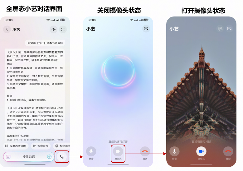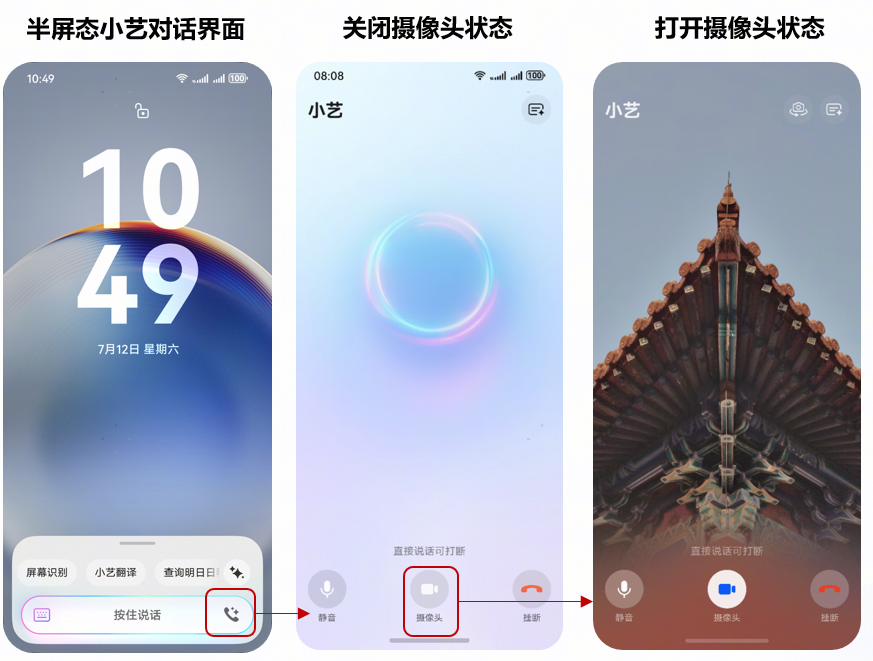 语音唤醒 / 长按手机电源键 / 长按导航条 → 唤醒半屏态小艺对话界面 → 点击右下角打电话图标 → 打开摄像头 → 进入陪你看世界的小艺