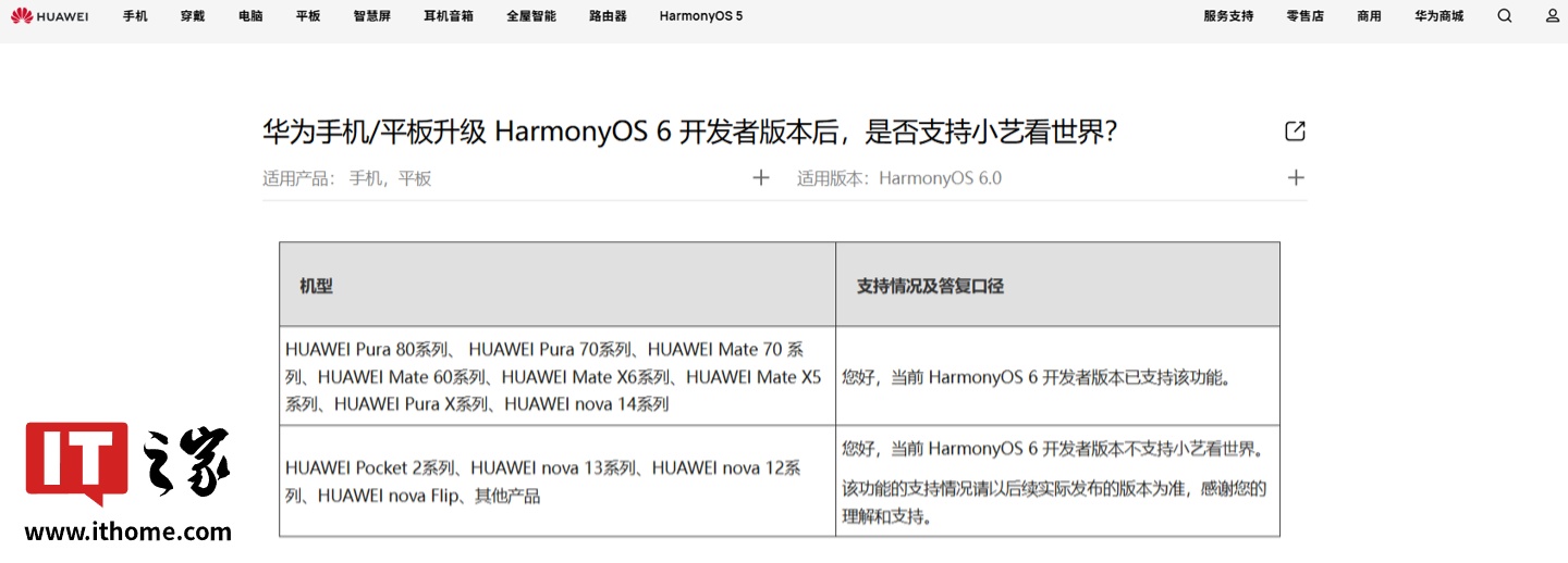 HUAWEI Pocket 2 系列、HUAWEI nova 13 系列、HUAWEI nova 12 系列、HUAWEI nova Flip、其他产品 | 当前 HarmonyOS 6 开发者版本不支持小艺看世界。 该功能的支持情况请以后续实际发布的版本为准。 |