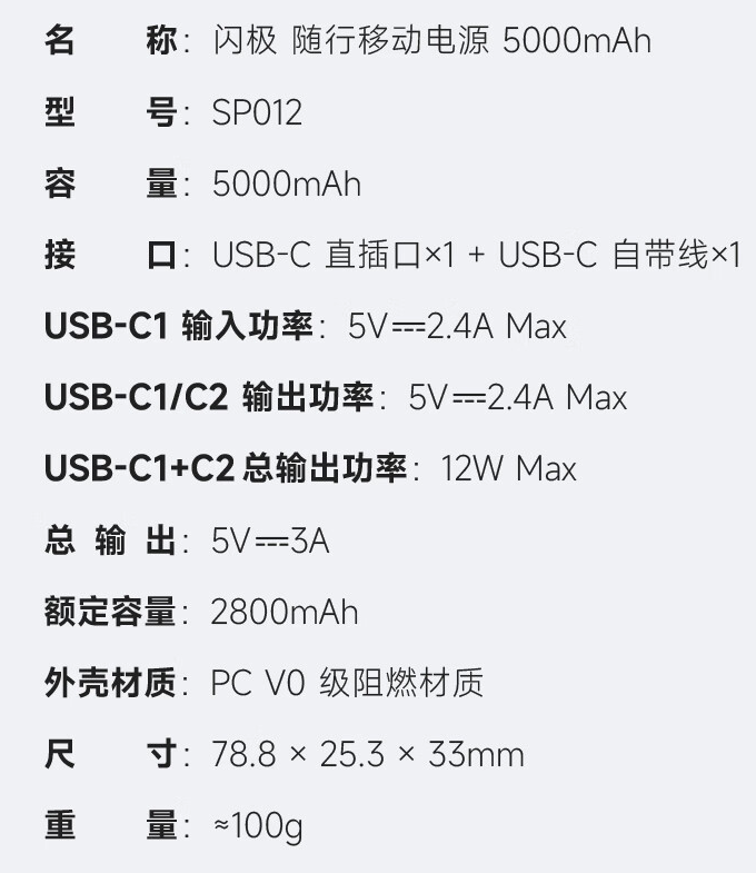 新品电池容量为 5000mAh,采用 21700 电芯,支持 12W 输入输出。材质方面,其采用 PC V0 级阻燃材质,可应对高温等多种情况。