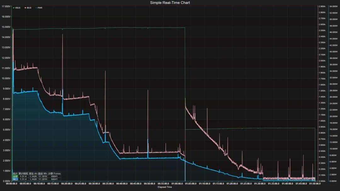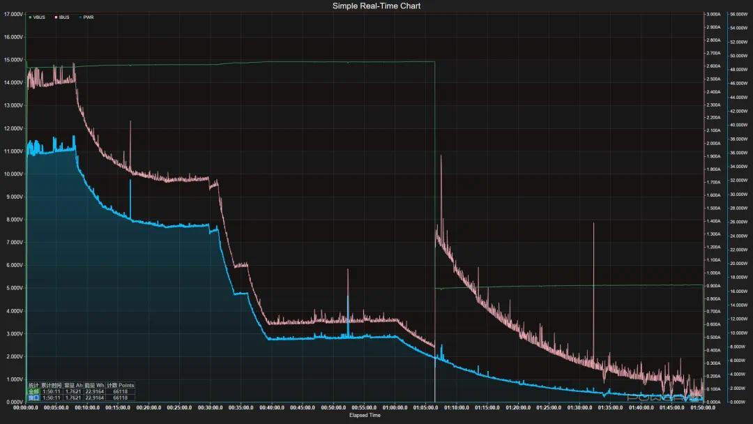 ▲iPhone 17 Pro Max 充电曲线图,蓝色折线为充电功率,红色折线为电流,绿色折线为电压
