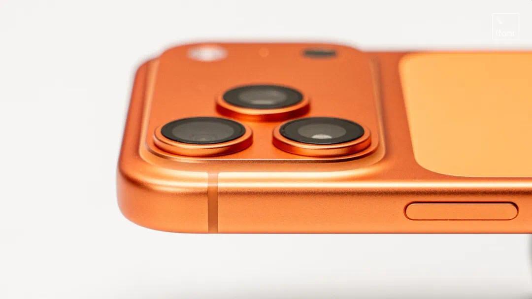 除了手感大升级,从钛金属换回铝合金还带来了另外两项材料优势——由于铝合金比钛合金更容易着色,今年的 iPhone 17 Pro 多出了这个醒目的「星宇橙」,比起前几年的「禁欲系」配色鲜亮不少。