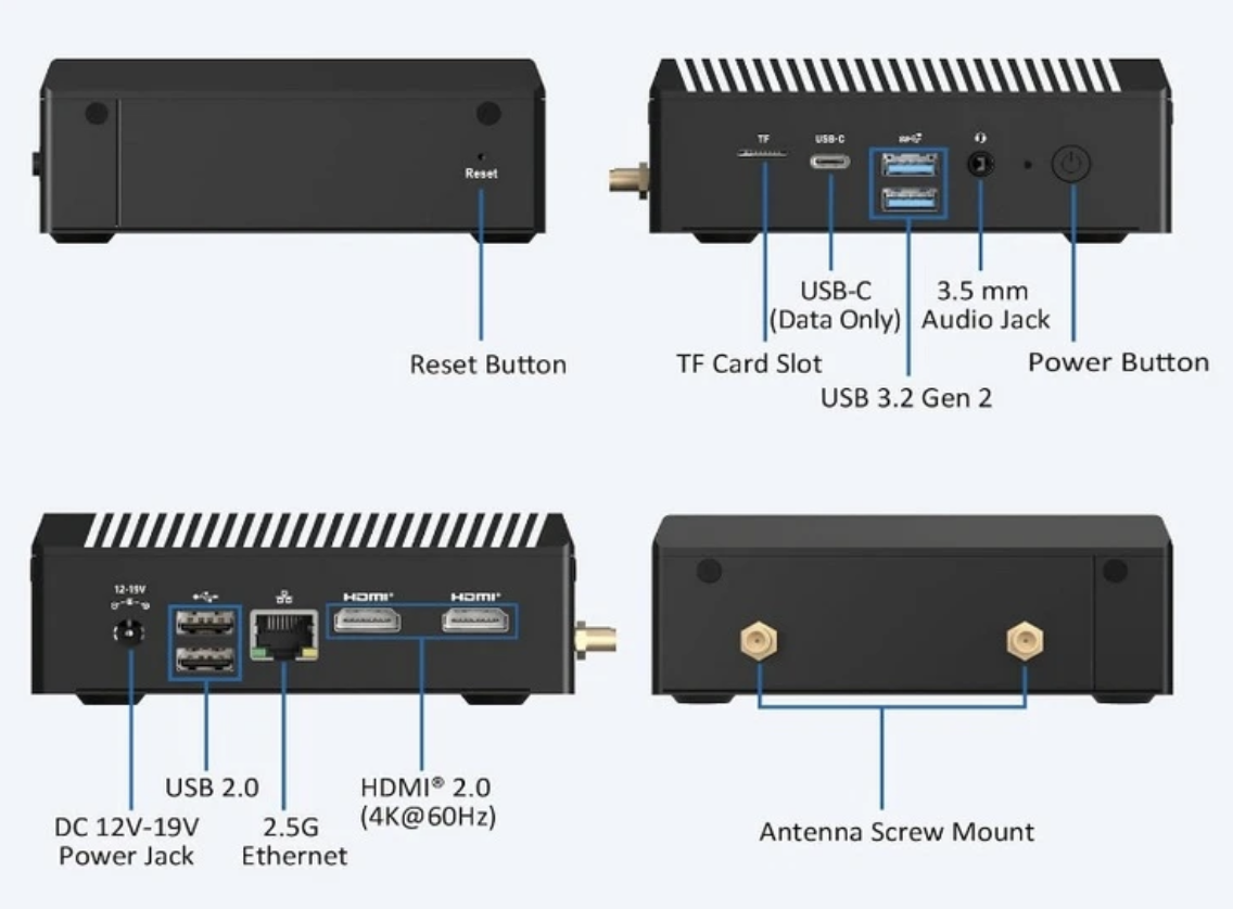 该机采用 8 核心 8 线程英特尔 N300 处理器,拥有 7W TDP,内置 16GB RAM 及 PCIe 3.0 M.2 SSD;内置 2 个 USB-A 2.0 接口、2 个 HDMI 接口、1 个 USB-C 接口、1 个 3.5mm 音频接口、1 个 microSD 读卡器。