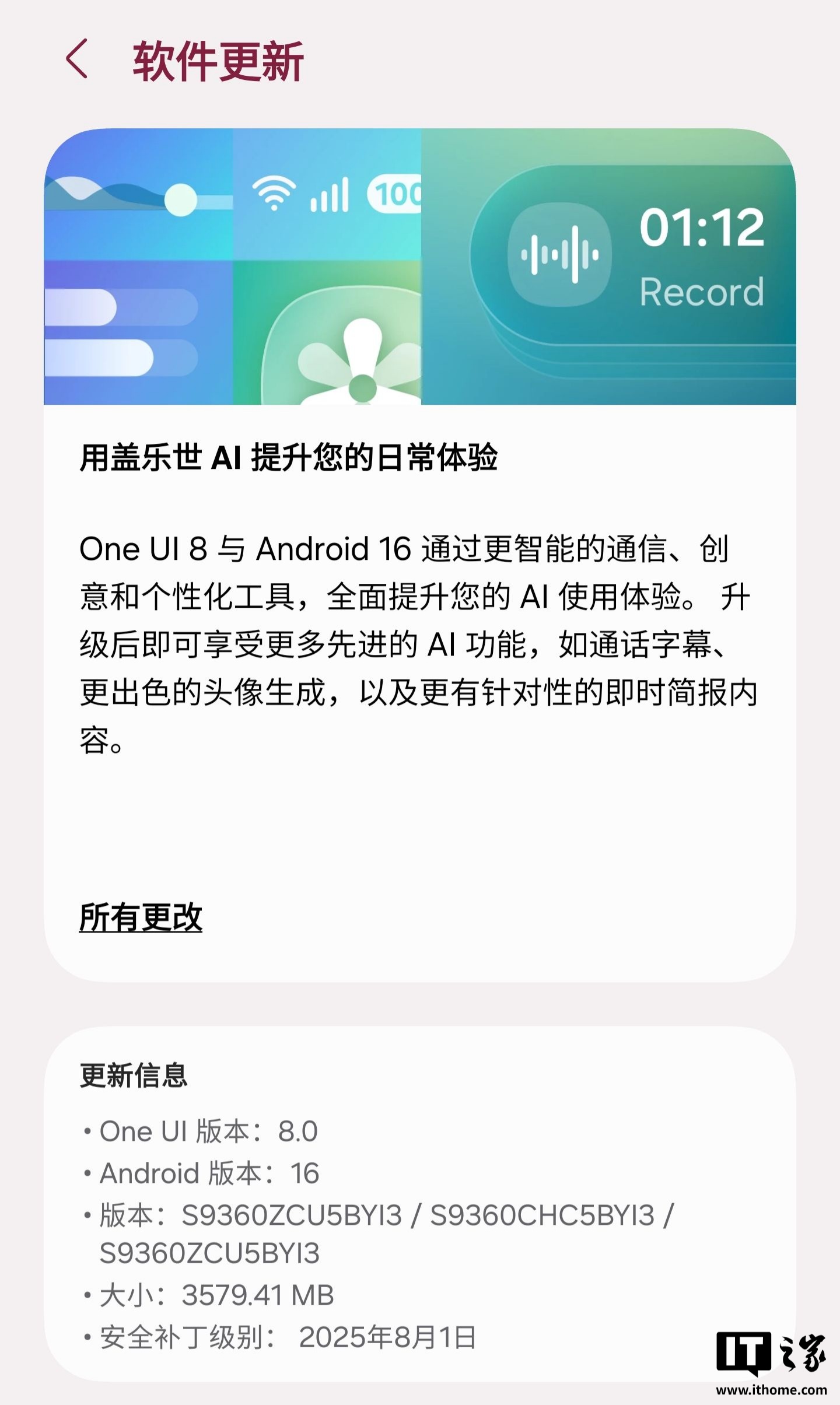 本次更新升级到安卓 16 系统,版本号包括 S9360ZCU5BYI3 / S9360CHC5BYI3 / S9360ZCU5BYI3,并同步推出了 2025 年 8 月 1 日安全补丁。