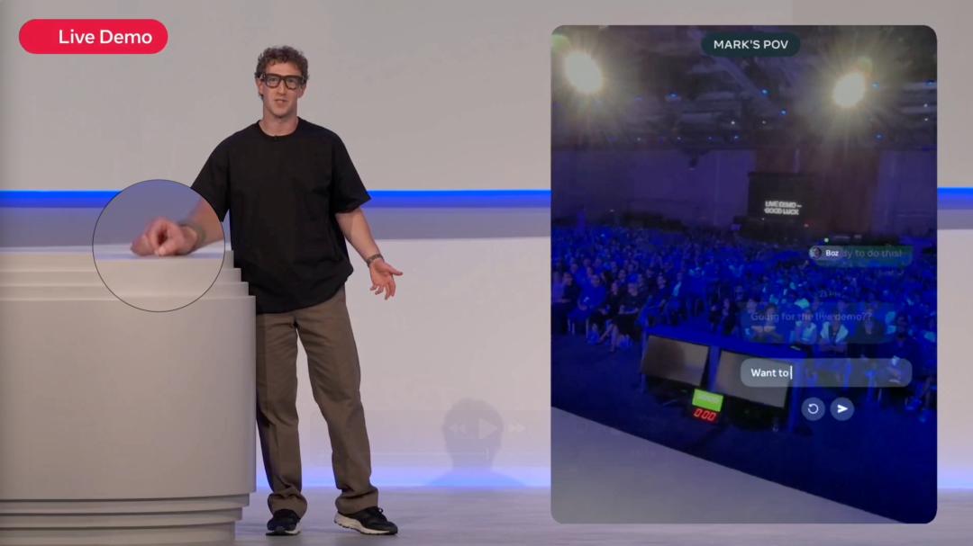 扎克伯格在采访中透露了一个有趣的细节:他已经能用这个系统达到每分钟30个单词的打字速度,几乎一整天都在用眼镜收发消息。他的高管们甚至能分辨出哪些消息是用眼镜发的——比如那些长度更短、但是秒回的信息。