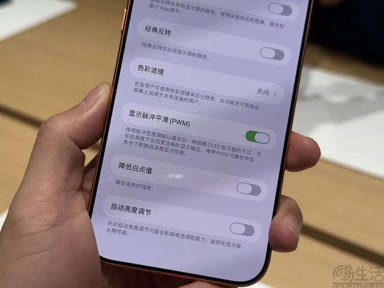 而且关于苹果今年全系“一视同仁”的这块新屏幕,还有一点值得一提,那就是它首次支持了完全关闭PWM调光的功能。很显然,苹果方面也注意到了消费者对于PWM调光在护眼方面的疑虑,并首次明确做出了技术上的改进。