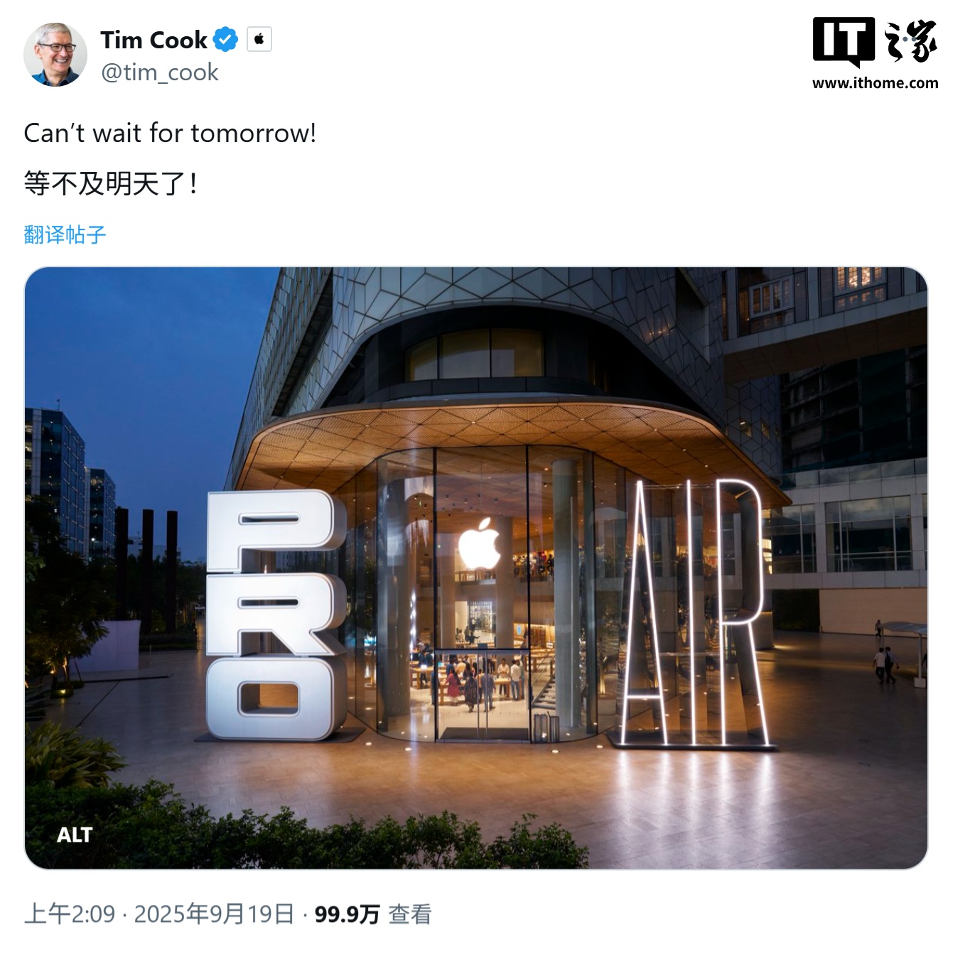IT之家 9 月 19 日消息,科技媒体 9to5Mac 今天(9 月 19 日)发布博文,报道称苹果首席执行官蒂姆・库克(Tim Cook)在 X 平台发布推文,分享了一组印度孟买 Apple BKC 零售店的照片,展示该门店通过独特的“Pro”和“Air”主题设计,吸引消费者。