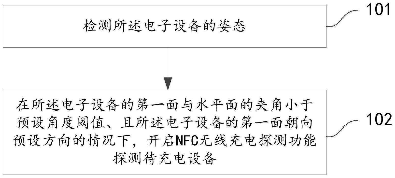 本申请公开了一种NFC无线充电控制方法、装置和电子设备,属于无线充电技术领域。所述NFC无线充电控制方法应用于电子设备,所述电子设备包括NFC天线,所述NFC天线贴近所述电子设备的第一面,所述第一面为所述电子设备的正面或反面,所述方法包括:检测所述电子设备的姿态;在所述电子设备的第一面与水平面的夹角小于预设角度阈值、且所述电子设备的第一面朝向预设方向的情况下,开启NFC无线充电探测功能探测待充电设备。